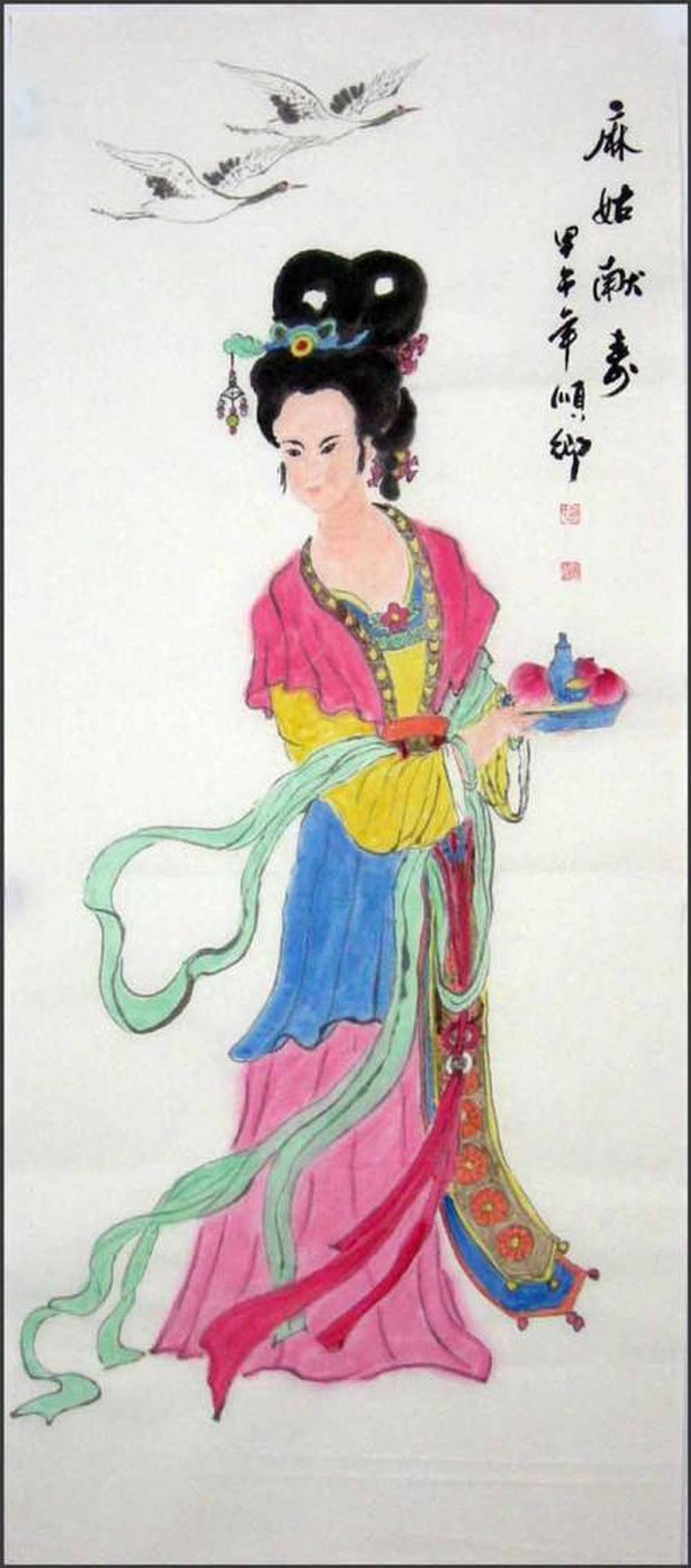<麻姑献寿>:献:把东西送给尊长或敬爱的人。指祝贺寿辰。麻姑,建昌人,修道于牟州东南余姑山。三月三日西王母寿辰,麻姑在绛珠河畔以灵芝酿酒,为王母祝寿。